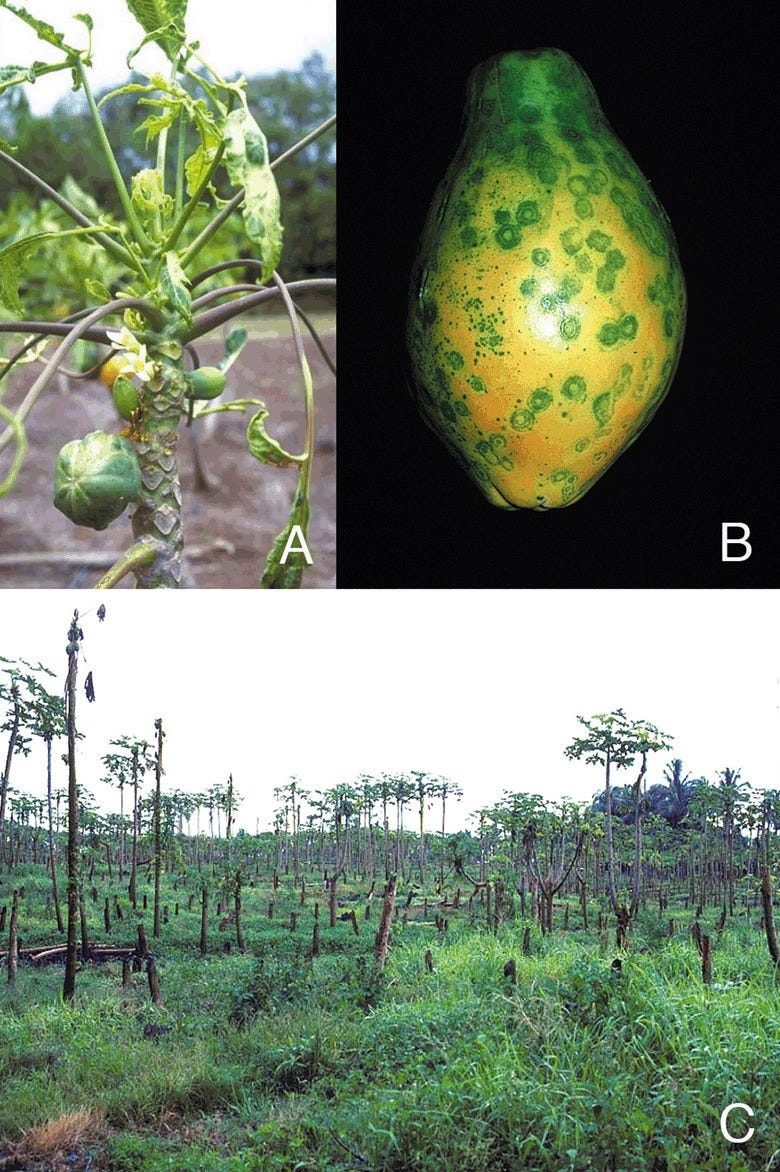 En la década de 1990, el virus de la mancha anular (PRSV) casi colapsa la producción de papaya en Hawái, de no ser por investigadores de la Universidad de Hawái y de Cornell, liderados por Dennis Gonsalves, quienes lograron insertar el gen de la cápside del virus en papayas comerciales, creando resistencia a la enfermedad.
